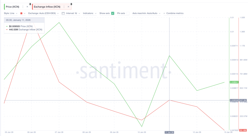 Even more important is exchange flow data. Daily exchange inflows, which track how many tokens are sent to exchanges and often act as a proxy for selling pressure, have collapsed. Inflows fell from roughly 440 million XCN to just 33 million in two days. That is a drop of over 90%, showing that potential sell-side pressure has dried up sharply.