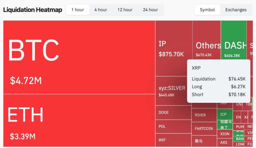 According to CoinGlass's liquidation heatmap, XRP liquidated for $76,450 in the past hour. What's interesting is not the total amount, though, but the structure: $6,270 came from longs, while $70,180 were taken out of short positions.