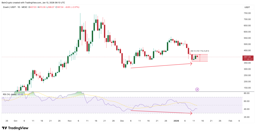 The rebound did not come out of nowhere. Between December 6 and January 10, Zcash printed a hidden bullish RSI divergence. The Zcash price formed a higher low, while the Relative Strength Index (RSI), a momentum indicator that measures buying and selling strength, formed a lower low. This pattern often signals that selling pressure is weakening before the price reacts.