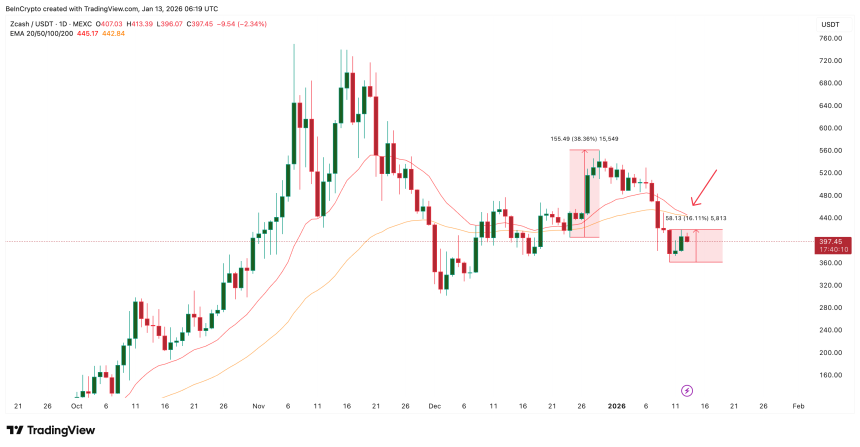 However, the rebound is running into structural resistance. Zcashs price is now trading below key exponential moving averages (EMAs). An EMA gives more weight to recent prices and helps identify trend direction. The 20-day EMA is drifting toward a bearish crossover below the 50-day EMA, a setup that often caps rebounds and restarts downtrends. These EMA levels are also acting as overhead resistance.