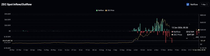 Spot exchange flows reinforce this risk. While Zcash still shows net exchange outflows, meaning coins are leaving exchanges rather than entering to sell, the intensity has dropped sharply. On January 7, net outflows peaked near $35.6 million.