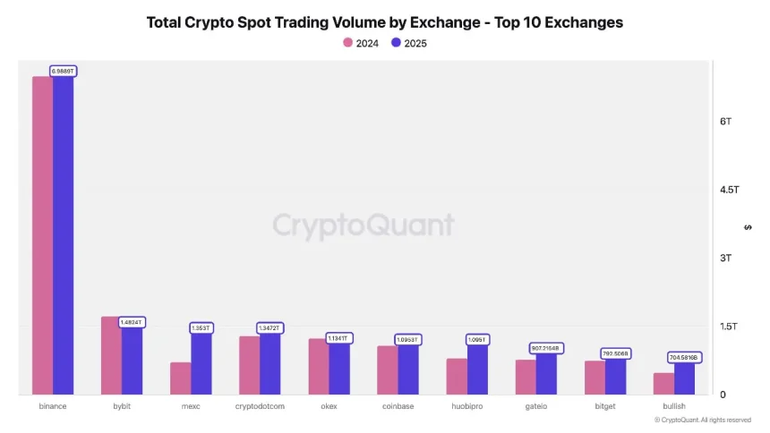 exchange activity increased in the previous year, with total controlled and decentralized spot trading volumes reaching approximately $18.6 trillion, according to CryptoQuant, a blockchain analytics platform.The $18.6 trillion was up 9% year-over-year, although growth was significantly reduced compared to 2024s 154% rise. On the other hand, Perpetual futures activity continued to be strong, increasing 29% year over year to $61.7 trillion, a $13.8 trillion increase over 2024.