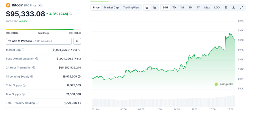 Bitcoin 24-Hour Price Chart on January 13, 2026. Source: CoinGecko