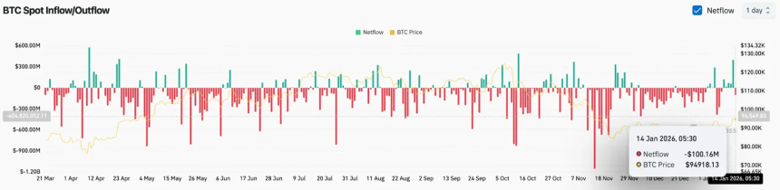 Exchange flow data reveals $100.16 million in net outflows on January 14, marking significant distribution as Bitcoin tested the $95,000-$96,000 resistance zone. When large outflows occur during rallies rather than corrections, it typically signals holders are moving tokens to exchanges to sell rather than withdrawing to cold storage.