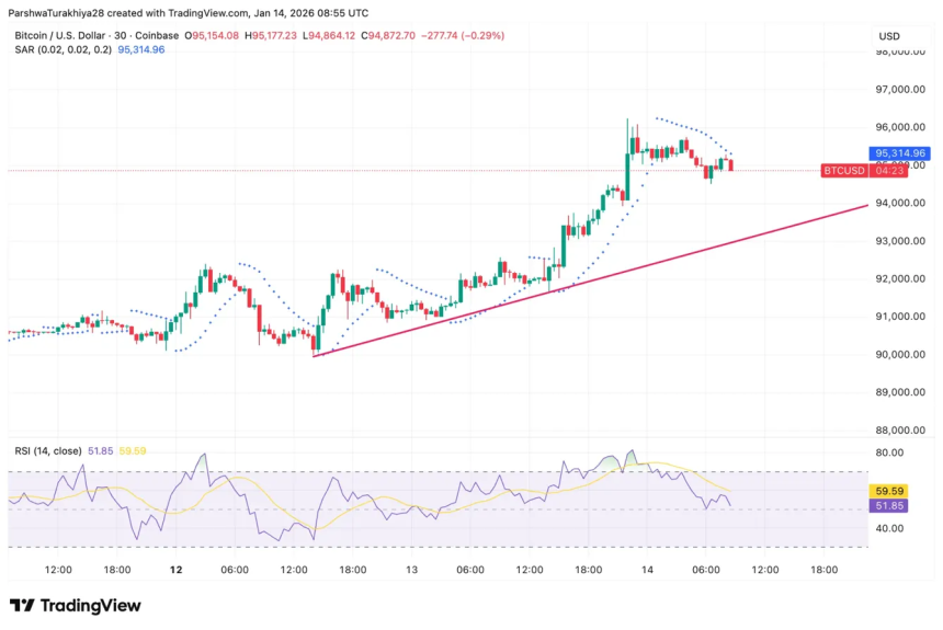The 30-minute timeframe shows Bitcoin consolidating just below the Parabolic SAR at $95,314 after the initial surge above $95,000. The RSI reads 51.85, neutral after cooling from overbought conditions during the rally.