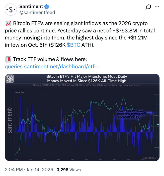 Spot Bitcoin ETF inflows, Jan. 2–14, 2026. Source: Farside