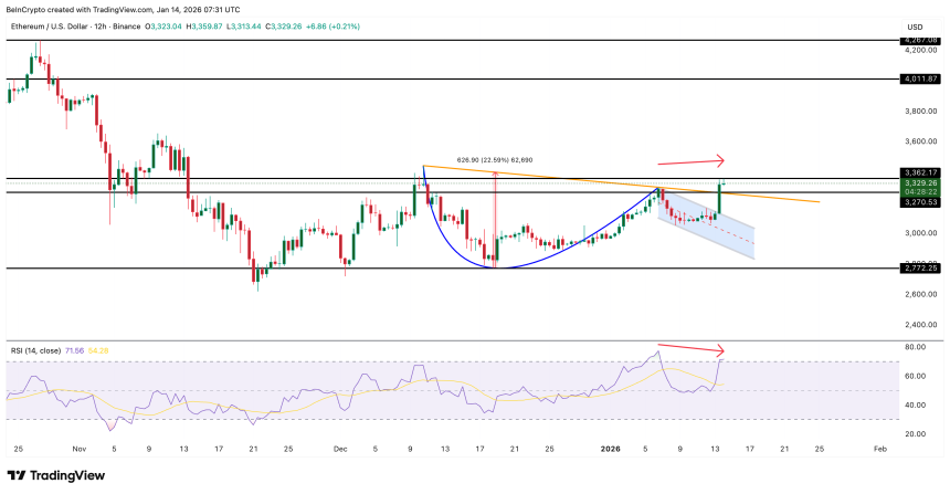While the price structure looks healthy, momentum indicators introduce conditional risk. On the same 12-hour timeframe, Ethereums Relative Strength Index, or RSI, is showing signs of a potential bearish divergence.