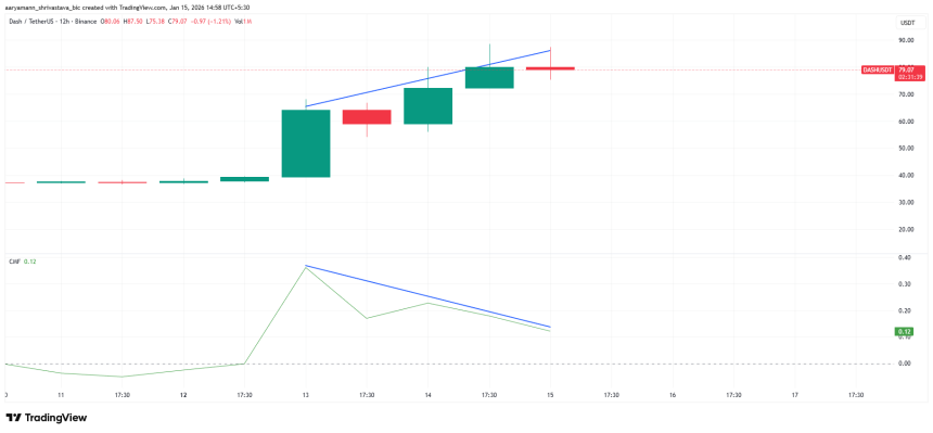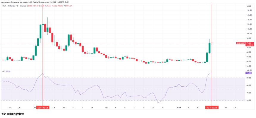 Dash trades near $79 at the time of writing, marking a 114% gain over the past 72 hours. The rally has been supported by positive headlines, including its integration with Alchemy Pay. However, catalysts often lose impact once priced in.
