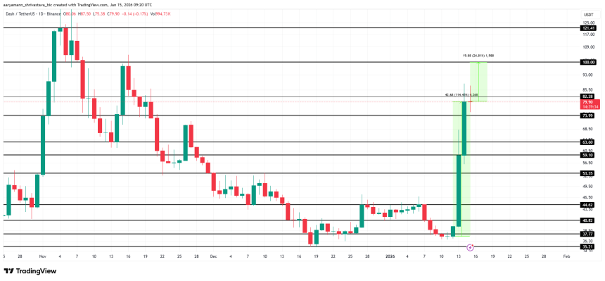 WikiBit 2026-01-16 04:03Dash has posted one of its strongest rallies in months, surging from $37 to nearly $80 in a short sp