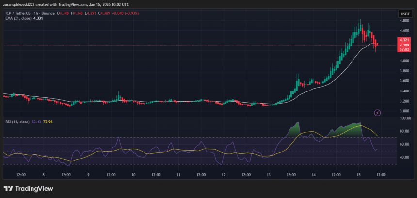 ICP/USDT 1-hour chart showing the rally from $3.20 to $4.70 between Jan. 13-15. RSI reached overbought territory above 70. | Source: TradingView
