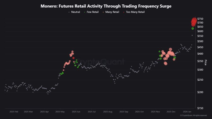 Now, the same signal is flashing for Monero. The retail-frequency threshold appeared around $714 as XMR traded deep into its parabolic advance. That matters because these setups often reflect emotional participation, where buyers enter late, liquidity thins, and volatility increases sharply.