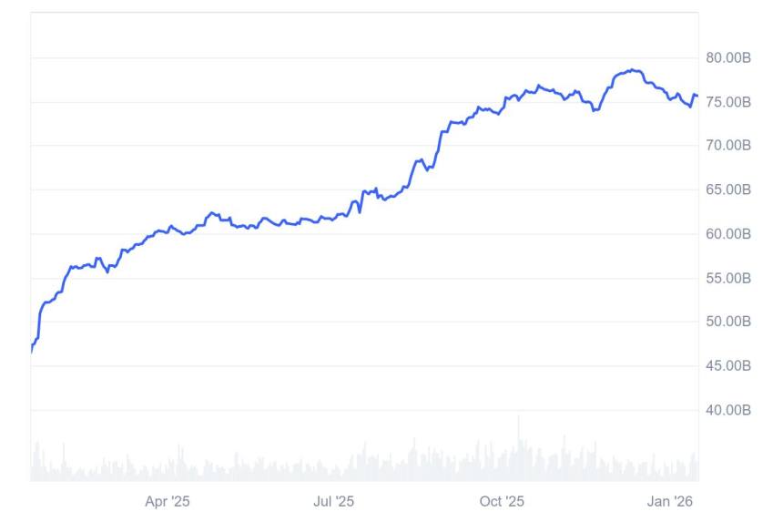 Data compiled by CoinMarketCap shows that the market capitalization stands at $75.55 billion today. It has remained inside this range since August last year.