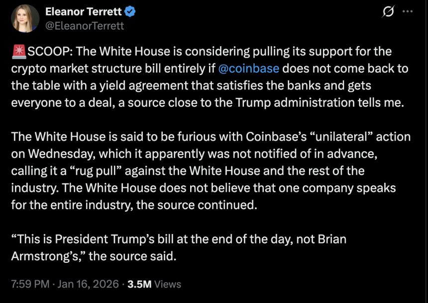 The White House threatened to drop support for the CLARITY Act in response to Coinbase withdrawing its support for the legislation, independent crypto reporter Eleanor Terrett reported on Saturday.