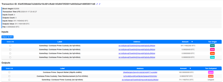 Reportedly, Gamestop shifted 100 BTC to Coinbase Prime on Jan. 17, 2026. The move was flagged by Sani, the onchain analyst who runs timechainindex.com. “Gamestop sent 100 BTC to Coinbase Prime,” Sani noted on X on Jan. 18, sharing the transaction details via a screenshot capturing the onchain movement.