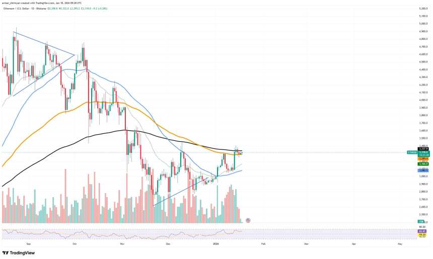 This is not euphoric behavior, rather, it is damage repair. Rarely do markets that enter a bull market do so quickly, instead they grind first. From a price action perspective, Ethereum is pushing straight into medium- and long-term resistance after regaining shorter-term moving averages. The price is capped between $3,300 and $3,400 by the 100 EMA and the upper edge of the support band.