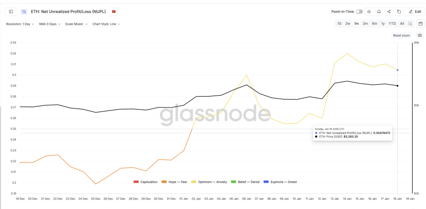 Ethereums aggregate NUPL, covering both short- and long-term holders, is hovering near its highest monthly level. Even after the recent drop of more than 6% from the January peak, NUPL only slipped from about 0.31 to 0.30. That is a small, 3% decline relative to the price move.