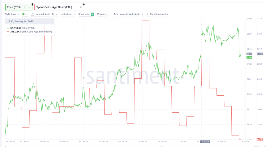 Spent Coins Age Band data, which tracks how many coins are actually moving on-chain, shows the opposite behavior. Since January 14, spent coin activity across cohorts has collapsed from roughly 318,000 ETH to about 84,300 ETH (monthly low). That is a drop of nearly 74%.