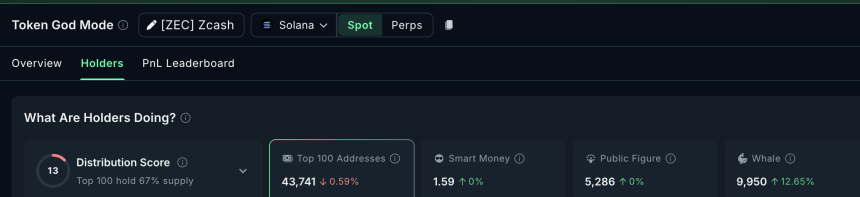 Over the past seven days, whales increased their Zcash holdings by 12.65%, lifting whale-held supply to roughly 9,950 ZEC. This group provided the strongest support during the selloff. In contrast, the top 100 addresses (mega whales) did not meaningfully add, suggesting large long-term holders are still cautious.