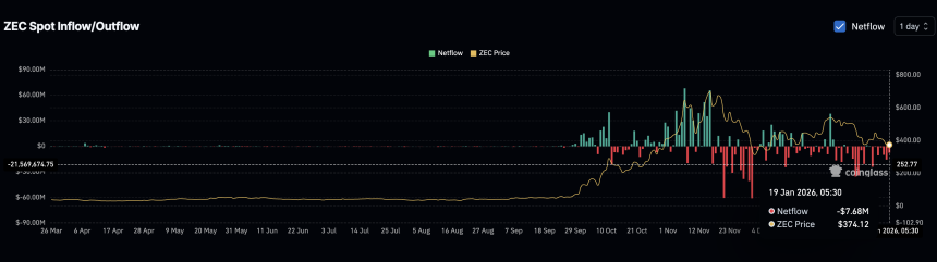In late November, Zcash saw peak daily exchange outflows near $61 million, signaling strong conviction buying. That level of demand is gone. On January 18, net outflows measured $15.7 million. By January 19, that figure dropped sharply to $7.68 million. This is an 87% decline from peak accumulation levels.