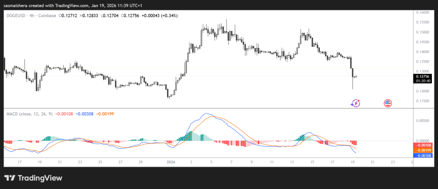 At press time, DOGE is trading at $0.1275, below the 20-day Exponential Moving Average at $0.1375 and the 50-day EMA at $0.1417, maintaining a bearish setup as both averages slope lower.