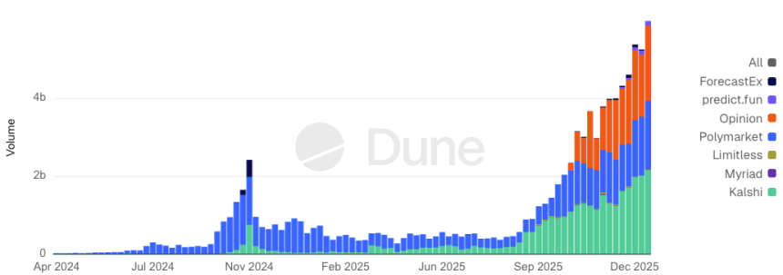 Trading volumes in prediction markets hit almost $6 billion by mid-January 2026. Source: Dune
