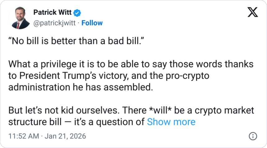 “There *will* be a crypto market structure bill — it‘s a question of when, not if,” Patrick Witt, the executive director of the President’s Council of Advisors for Digital Assets, said on Tuesday.