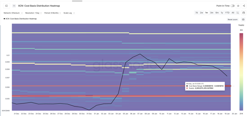 Even if XCN price slips further, the downside is becoming increasingly defined. Cost basis data shows a dense accumulation zone between $0.0060 and $0.0061, where roughly 4.9 billion XCN were acquired. This cluster represents a level where many holders are already near breakeven, making it a natural area for selling pressure to fade and for buyers to step in.