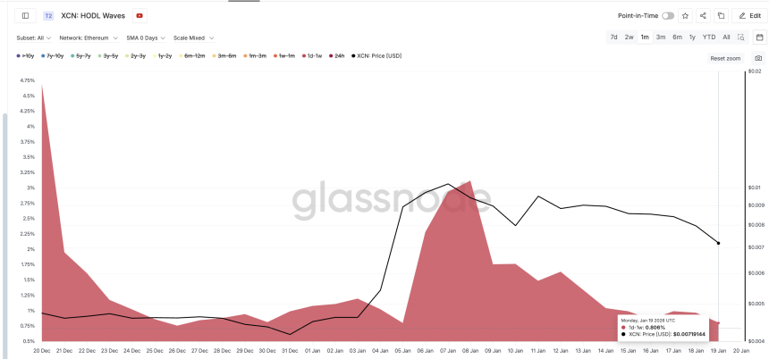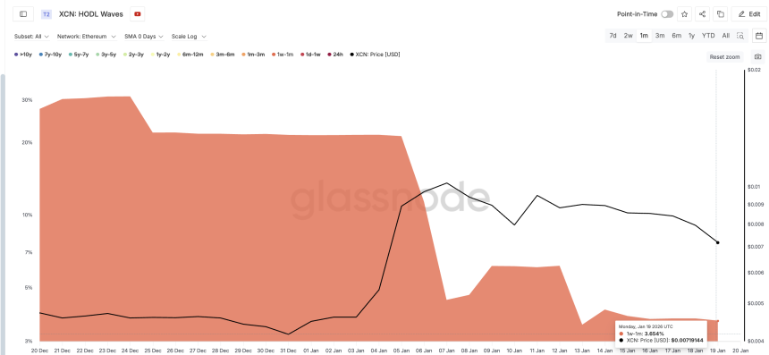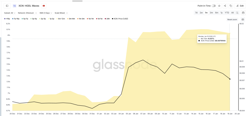 At the same time, longer-term holders are moving the other way. Wallets holding XCN for 6 to 12 months increased their share of supply from 6.81% to 8.03% between December 20 and January 19.