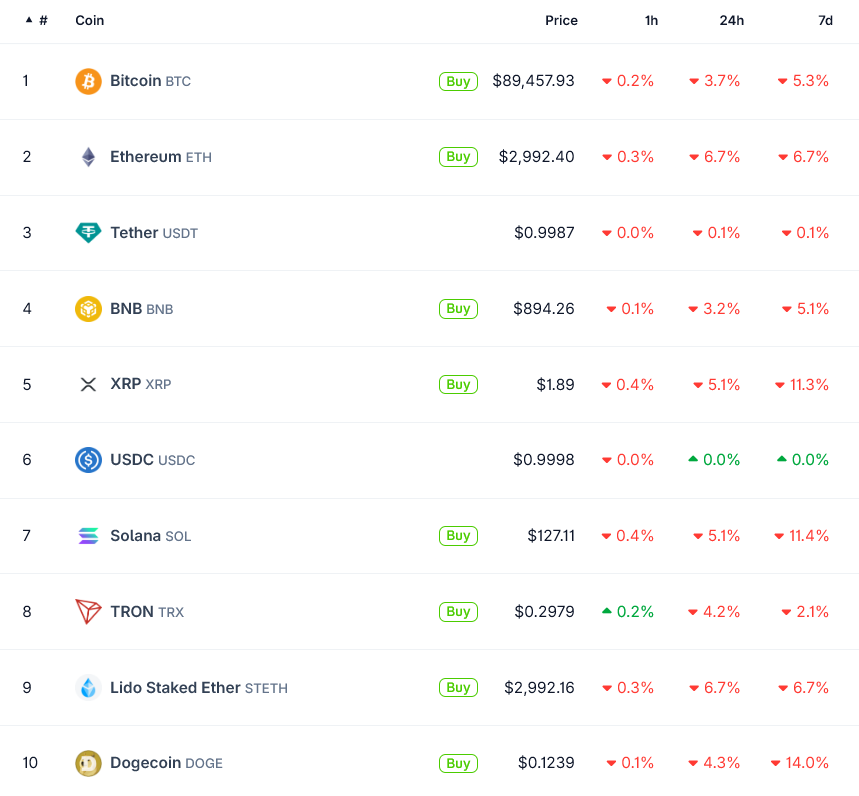 Bitcoin fell back below $90,000, while Ethereum slipped under $3,000, as investors reassessed macro risks following Bessents remarks at the World Economic Forum in Davos.