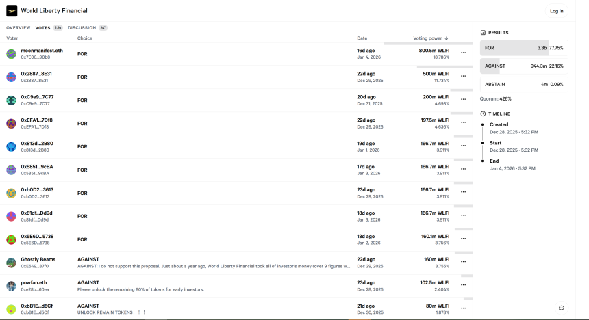 “This is in contrast to the real voters lower in the screenshot, who have all been locked from accessing their WLFI tokens since TGE, and unable to vote on an unlock until the team allows it,” DeFi^2 claimed on X.