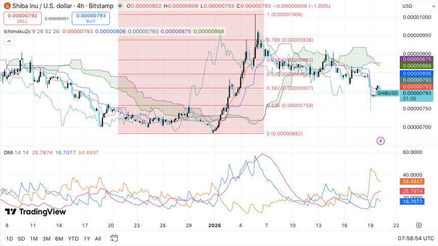 WikiBit 2026-01-20 22:03Shiba Inu (SHIB) has started to cool off after a strong 4-hour breakout rally, with price now retrea