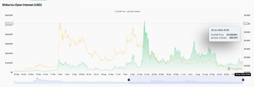 Derivatives data has also reflected caution. SHIB open interest once surged above $500 million during a peak speculation cycle. However, leverage has since unwound and now sits near $88.55 million. That decline suggests traders have reduced risk exposure.