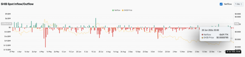 Spot flows have added to the cautious outlook. Additionally, netflows have stayed mostly negative, with outflows dominating recent sessions. The latest reading near -$609.7K on Jan. 20 shows sellers still control the tape. Consequently, SHIB may need a stronger accumulation wave before any sustained rebound develops.
