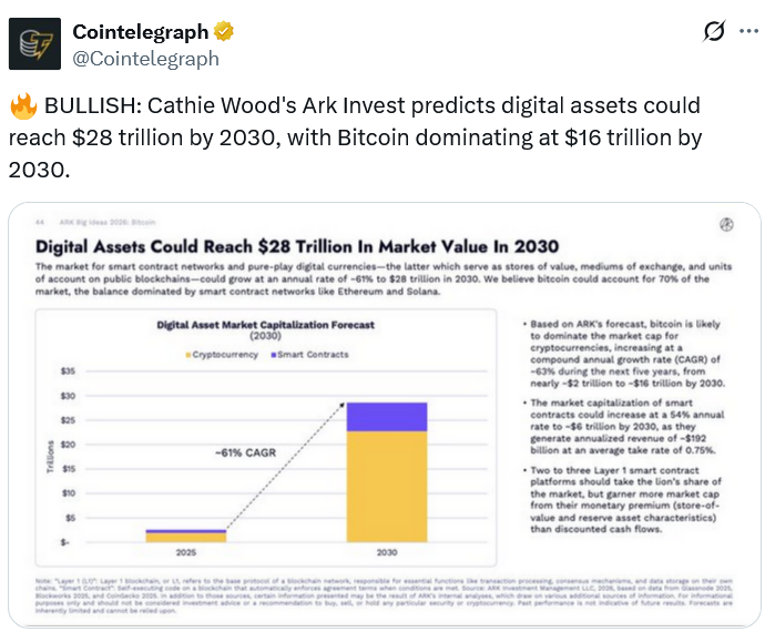 ARK estimated in its “Big Ideas 2026” report on Wednesday that the crypto market would expand at a 61% compound annual growth rate (CAGR) to meet the $28 trillion target by 2030, adding that Bitcoin could account for 70% of that figure.