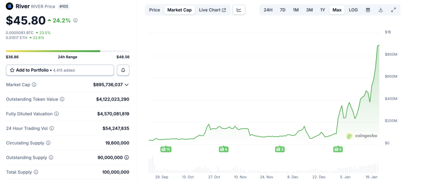According to CoinGecko, RIVER posted a new all-time high of $48.56 earlier today. Over the past 24 hours, the token appreciated 24.2%, significantly outperforming the broader markets roughly 1% gain. At press time, it was trading at $45.8.