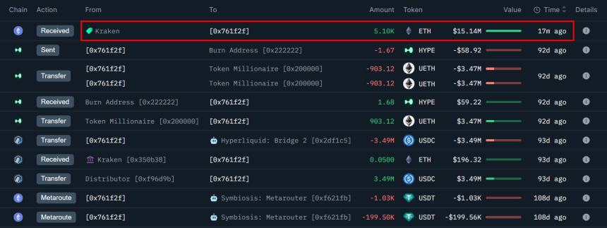 An anonymous Ethereum whale has made a comeback, and this one was big. Top U.S. exchange Kraken got hit by pulling in 5,099 ETH equal to around $15.17 million. The whale staked the full amount into Lido right away and converted it to stETH in minutes.