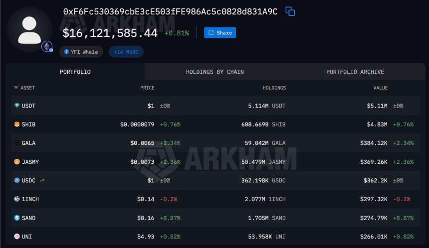 A Shiba Inu whale wallet holding over $16.1 million secretly moved 15 billion SHIB, worth $118,350, in a transaction that raises more questions than answers. The wallet, labeled “YFI Whale” on Arkham, holds 608.6 billion SHIB worth about $4.83 million, making it one of the top nonexchange holders.