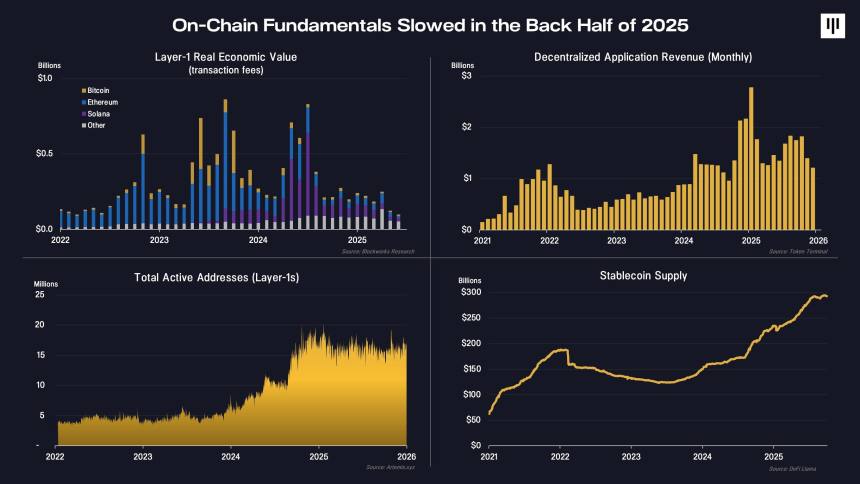 That dynamic helped digital asset equities outperform tokens during the year. On-chain fundamentals also softened in the second half, with declines in fees, application revenue, and active addresses, even as stablecoin supply continued to grow.