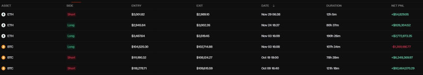 The same wallet made over $100 million during October's crypto selloff, riding two Bitcoin (BTC) shorts and an ETH long opened in early October to combined profits of $101.6 million across positions that lasted between 12 and 190 hours.