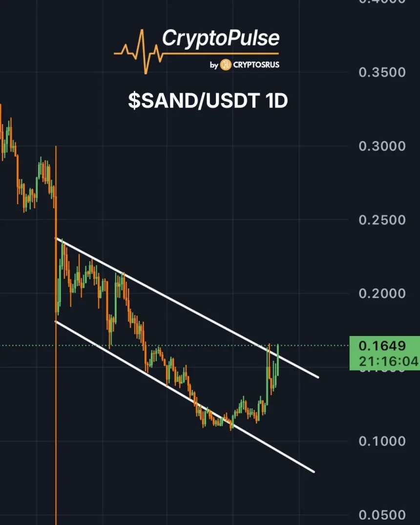 SAND has broken decisively above its multi-month descending channel, marking a clear structural change on the daily chart. The token no longer trades under the downward resistance line that had capped every recovery attempt for months.
