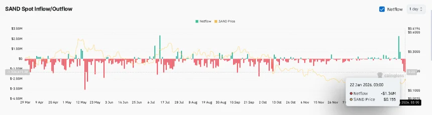 Spot netflows have remained negative, reinforcing the idea that the breakout occurred alongside steady supply absorption. At the time of reporting, SAND recorded net exchange outflows of over $1.34M