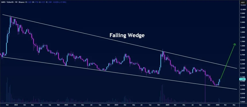 On higher timeframes, traders have noted that SAND has bounced from the support of a falling wedge structure. Momentum indicators have begun shifting in a more constructive direction, reinforcing the idea that buyers have regained influence after months of weakness.