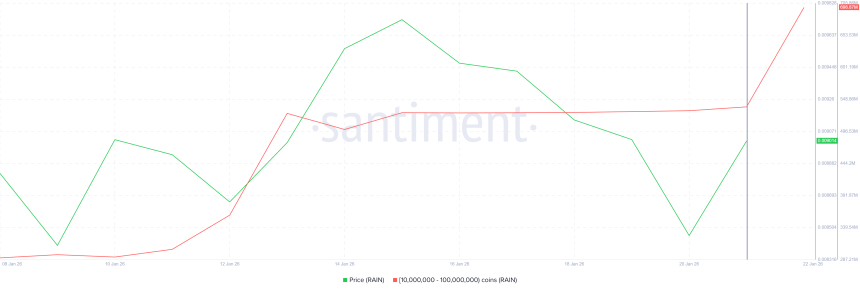 Whale activity has played a central role in supporting RAINs recent price action. Addresses holding between 10 million and 100 million RAIN accumulated 162 million tokens in the past 24 hours alone. At current prices, the buying is valued at approximately $1.55 million, signaling strong conviction among large holders.