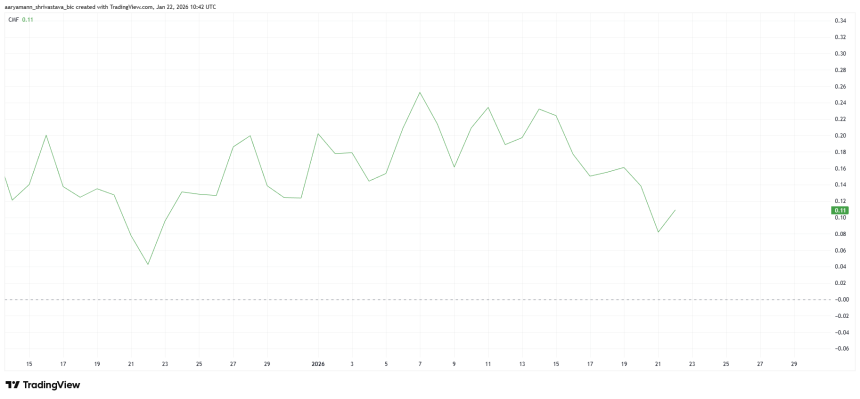 Despite whale accumulation, broader market participation appears less supportive. The Chaikin Money Flow indicator shows declining inflows, suggesting reduced capital entering the asset overall. CMF tracks buying and selling pressure through price and volume, offering insight into underlying demand trends.