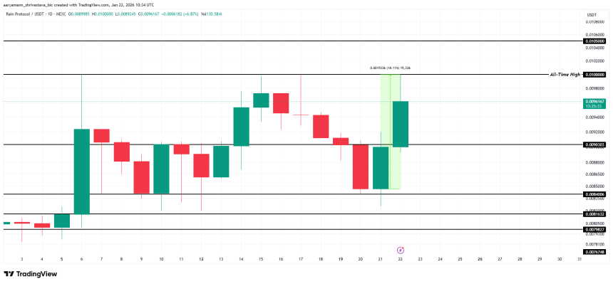 RAIN surged 18.1% during intraday trading, briefly touching $0.0100. This level matches the all-time high set more than two weeks ago. Reaching it again confirmed strong speculative interest, but it did not trigger a decisive breakout.