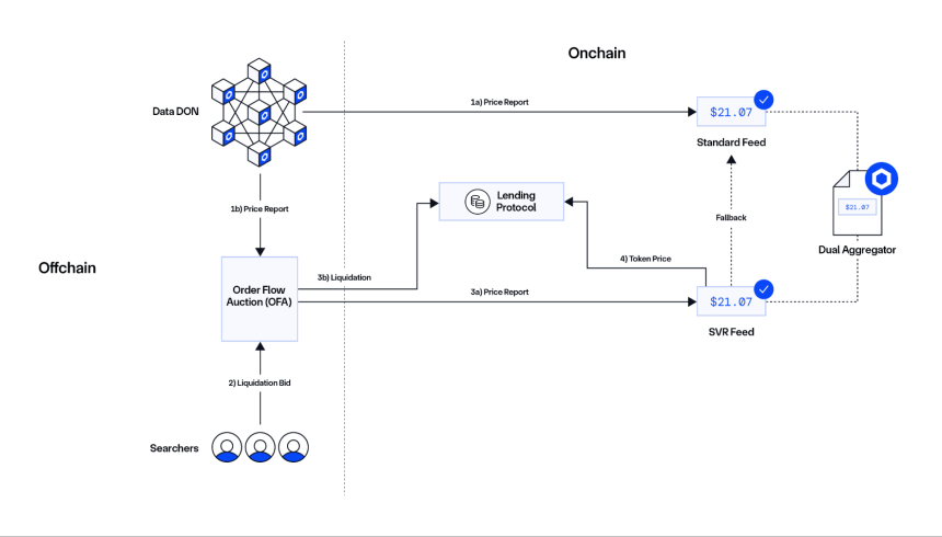Chainlink SVR uses a dual-path system where price updates flow through both a standard feed and an order flow auction, allowing searchers to bid for liquidation rights while the lending protocol receives verified pricing. | Source: Chainlink