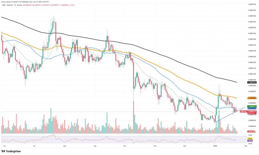 After a protracted decline, SHIB is stabilizing around a local support zone, and price action indicates that the asset is trying to restore some sort of market structure rather than continuing a straight bleed.