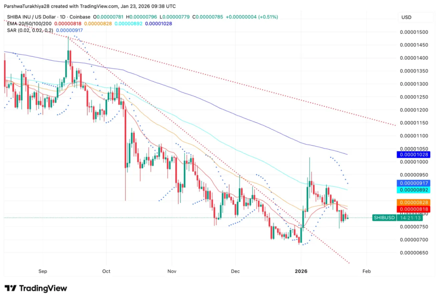 On the daily chart, SHIB trades inside a descending channel that has contained price since the September highs near $0.0000145. Each rally attempt has failed at declining resistance while the series of lower lows continues.
