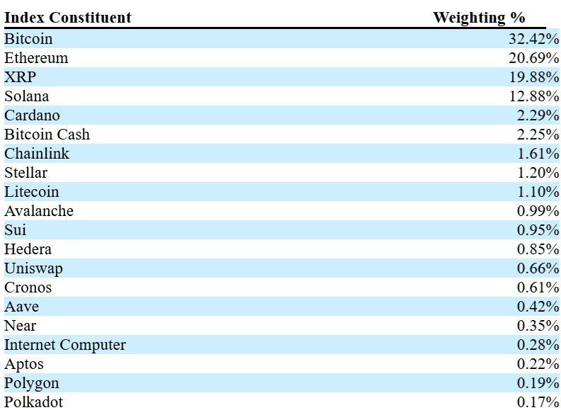 As of Dec. 31, 2025, bitcoin, ethereum, XRP, solana, and cardano represented approximately 88.15% of the indexs total weight, while the remaining allocation was spread across 15 additional crypto assets, each weighted below 3% and each exceeding $1 billion in market capitalization at that date.