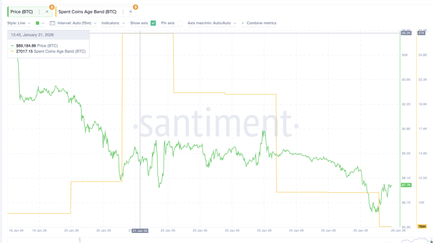 The Spent Coins Age Band, which tracks how many coins of all holding ages are being moved on-chain, has dropped sharply. Coin movement fell from roughly 27,000 to almost 7,690, a decline of about 72%. When fewer coins move, it usually means fewer holders are selling. This aligns closely with the RSI signal and explains why the Bitcoin price bounced rather than breaking down immediately.